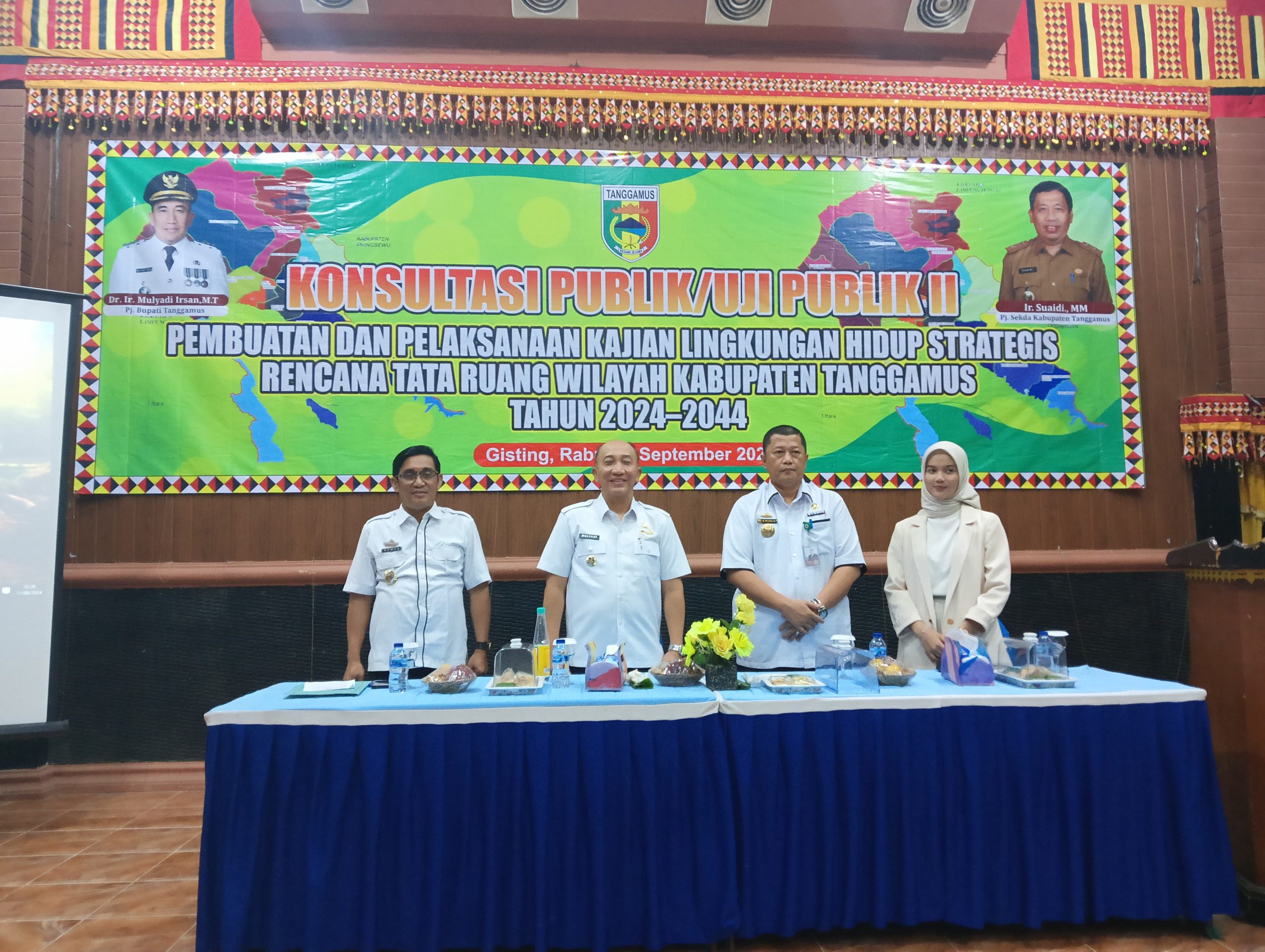 HARIANPROGRES.com – Pj Bupati Kabupaten Tanggamus Mulyadi Irsan, membuka kegiatan konsultasi publik II pembuatan dan pelaksanaan KLHS Rencana Tata Ruang Wilayah (RTRW) Kabupaten Tanggamus Tahun 2024-2044, di gedung Serumpun Padi Kecamatan Gisting, Rabu (11/9/2024).