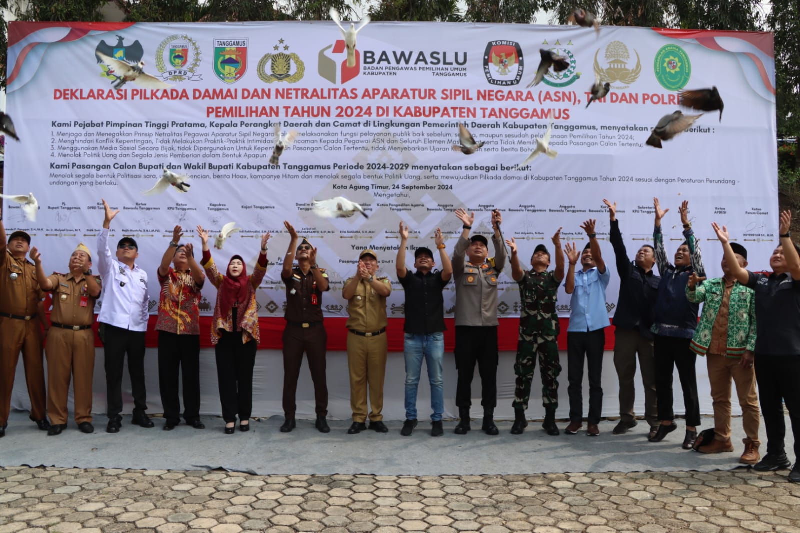 Penanda komitmen bersama, di puncak acara Deklarasi Pilkada Damai ditandai dengan pelepasan burung merpati oleh Pj Sekretaris Daerah Tanggamus, Suaidi, didampingi unsur Forkopimda, TNI, Polri, serta para pasangan Calon Bupati dan Wakil Bupati.