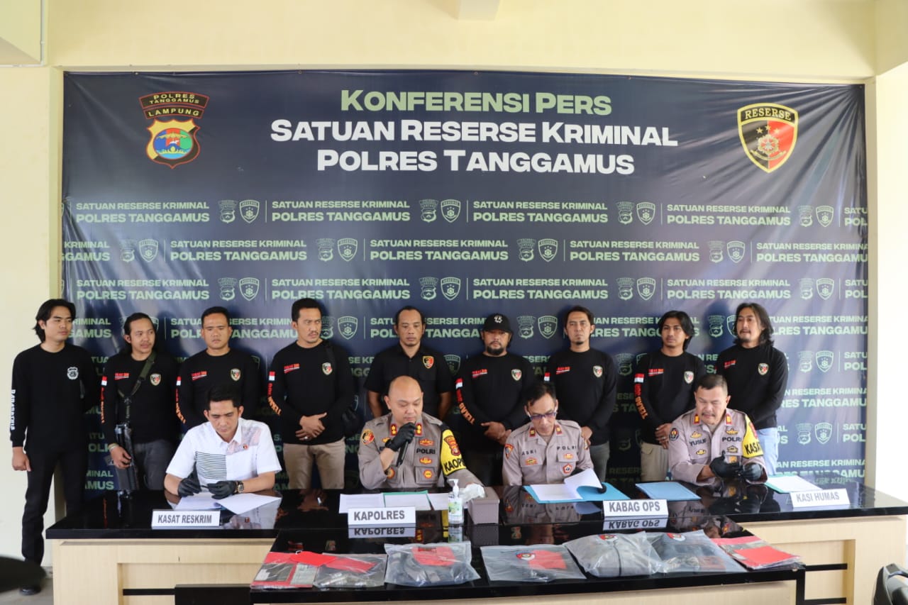 Saat konferensi Pers, Kapolres, AKBP. Rivanda, didampingi Kasat Reskrim Polres Tanggamus, AKP. Khairul Yassin Ariga, S.Kom., M.H., dan Kasi Humas, AKP. M Yusuf, S.H.