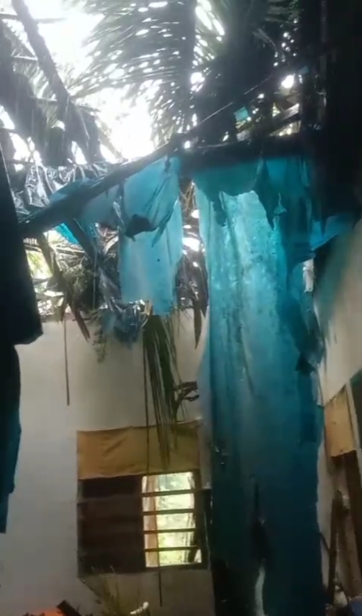 Pohon kelapa tumbang disaat terjadi hujan deras disertai angin kencang, namun beruntung tidak ada korban jiwa dalam peristiwa tersebut, namun bagian atap rumah mengalami rusak parah.